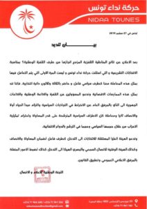وندّد “نداء تونس”، بما وصفها بــ ” الممارسات الاقصائية”، داعيا التلفزة والإذاعة الوطنية، والإذاعات الجهوية إلى النأي بالمرفق العام عن الانخراط في التجاذبات السياسية، والتزام مبدئي الحياد والإنصاف ومعاملة كل الأطراف السياسية المرشحة على قدر المساواة واحترام تمثيلية الأحزاب من خلال حجمها السياسي و حجما في الترشح بالدوائر الانتخابية.