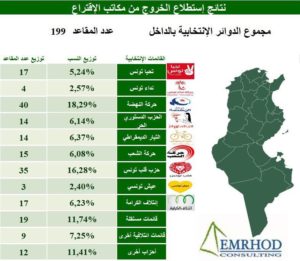 واظهرت النتائج فوز حزب النهضة بالمرتبة الأولى بنسبة 18.29 بالمائة، أي بمعدل 40 مقعدا، يليه حزب “قلب تونس”، بنسبة 16.28 بالمائة، وبمعدل 35 مقعدا.