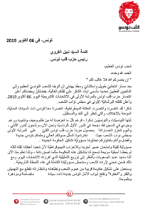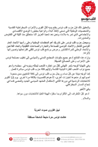 وأكد المرشح الرئاسي، أن حزبه “يفتح يديه لكلّ القوى والأحزاب الديمقراطية التقدمية والشخصيات الوطنيّة التي تسعى لإنقاذ البلاد والواعية بخطورة الوضع الاقتصادي والاجتماعي الذي تمر به البلاد”، وسينطلق بداية الليلة في التفاوض والمشاورات.