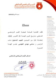 تلقّت الكتابة العامة للنجم الساحلي رسميا استقالة نائب الرئيس الحبيب السايح ورئيس فرع كرة القدم مهدي العجيمي من مهامهما.