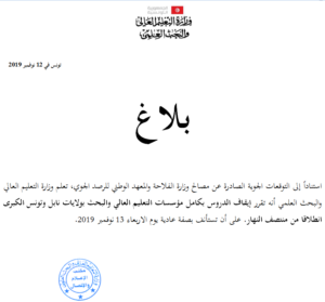 أعلنت وزارة التعليم العالي والبحث العلمي، أنه تقرر إيقاف الدروس بكامل مؤسسات التعليم العالي والبحث العلمي، بولايات نابل وتونس الكبرى وبنزرت وجندوبة وسوسة والمنستير والقيروان والمهدية، انطلاقا من منتصف النهار.