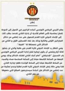 دعت هيئة الترجي الرياضي، الاتحاد الدولي لكرة القدم إلى زيادة عدد التذاكر المخصّصة للجماهير لمتابعة كأس العالم للأندية، الذي سيشهد مشاركة فريق باب سويقة.