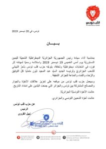 أكد حزب “قلب تونس”، سعيه للعمل على تعزيز العلاقات والمصالح المشتركة بين تونس والجزائر، عقب تسلّم عبد المجيد تبون رئاسة الجزائر.