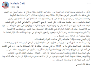 نشر المدير التنفيذي السابق لحركة نداء تونس حافظ قائد السبسي، تدوينة على حسابه الشخصي على فيسبوك يتهم فيها رئيس حكومة تصريف الأعمال يوسف الشاهد، “بوقوفه وراء فشل وثيقة قرطاج 2”.