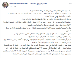 اعتبر رئيس حزب “مشروع تونس”، محسن مرزوق، أنه إذا استطاعت الكتل التي رفضت حكومة الحبيب الجملي، الاتفاق على تشكيل حكومة جديدة فإنه يمكن التخلي عن حركة “النهضة”.
