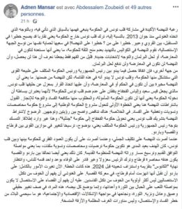 وكتب عدنان منصر، في تدوينة له على موقع “فيسبوك”، أن ترك “قلب تونس” خارج الحكومة يعني إمكانية حدوث تقاربا بين نبيل القروي وعبير موسي، وهو ما قد يصبح خطيرا على مستقبل “حركة النهضة”، وفق قوله.