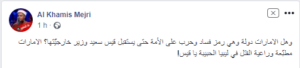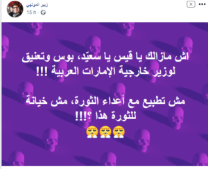 وكتب الداعية خميس الماجري، على صفحته الرسمية “فيسبوك”، “وهل الإمارات دولة وهي رمز فساد وحرب على الأمة، حتى يستقبل قيس سعيّد وزير خارجيتها؟”.