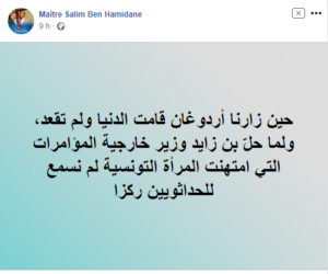 فقد انتقد الوزير السابق، سليم بن حميدان، غياب ردود الفعل، قائلا “حين زارنا أردوغان، قامت الدنيا ولم تقعد، ولما حل بن زايد خارجية المؤامرات التي امتهنت المرأة التونسية لم نسمع للحداثويين ركزا”.