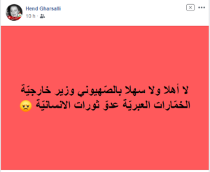 بدورها دونت هند غرسلي قائلة، “لا أهلا ولا سهلا بالصهيوني وزير خارجية الخمارات العبرية عدو ثورات الإنسانية”.