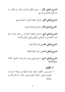 وأوضحت الوثيقة اعتزام الفخفاخ، وضع 7 مشاريع كبرى تكون بداية لمسار يمتد طيلة العهدة الحكومية، تتركز حول إصلاح القطاعات الحيوية كالصحة والتعليم، وإصلاح المنظومة الفلاحية، وإنجاز النقلة الطاقية والرقمية.