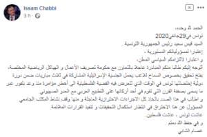 وقال الشابي، أن هذه الخطوة تتزامن مع ما “تتعرض له القضية الفلسطينية من أخطر مؤامرة منذ وعد بلفور، عبر ما يسمى بصفقة القرن، التي تقوم في أحد أركانها على التطبيع العربي مع العدو الصهيوني”، وفق قوله..