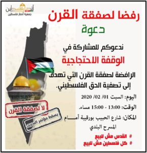 دعت جمعيات إلى التظاهر وتنظيم وقفة إحتجاجية يوم السبت المقبل، رفضا لصفقة القرن التي أعلن عنها الرئيس الأمريكي، دونالد ترامب، يوم الثلاثاء.