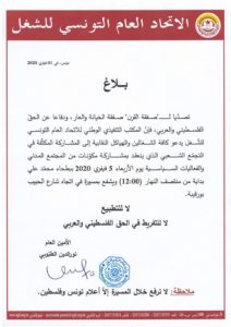 ينظم الاتحاد العام التونسي للشغل، ومحموعة من الأحزاب ومنظمات المجتمع المدني، مسيرة يوم الأربعاء المقبل، للتنديد بما يسمى بــ “صفقة القرن”.