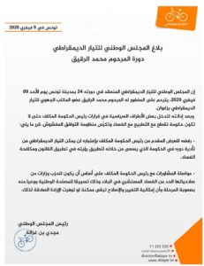 وعبّر المجلس الوطني للحزب، عن إدانته لتدخّل بعض الأطراف السياسية في قرارات إلياس الفخفاخ، “حتى لا تكون حكومة تقطع مع التطبيع مع الفساد وتكرّس منظومة التوافق المغشوش”، مشيرا إلى أنه سيواصل المشاروات مع الفخفاخ، على أساس أن يكون للحزب وزارات من صلاحياتها الحدّ من الفساد المستشري في البلاد، وفق نصّ البيان.