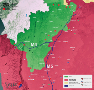 وتاليا خريطة ترصد أماكن تواجد نقاط المراقبة التركية، وكذلك أماكن نفوذ النظام السوري والمعارضة في أرياف إدلب وحلب واللاذقية، وسط اشتداد المعارك، وتظهر كذلك تحركات نظام الأسد، على الطريقين الدوليين “أم4″ و”أم5”.