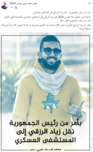 وقالت الصفحة الرسمية لقيس سعيد على “فيسبوك”، أنه تم نقل زياد الرزقي إلى المستشفى العسكري بالعاصمة لتلقي العلاج.