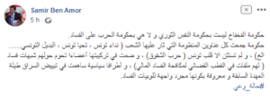 وقال سمير بن عمر، في تدوينة على موقع “فيسبوك”، أن الحكومة “جمعت كل عناوين المنظومة التي ثار عليها الشعب، وهي “نداء تونس”، و”تحيا تونس”، و”البديل التونسي”، و لم تستثن إلا حزب “قلب تونس”، وفق قوله.