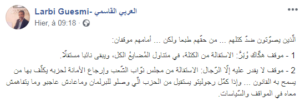 ونشر عضو ملس الشورى في الحركة، العربي القاسمي، تدوينة على موقع “فيسبوك”، قائلا فيها بأن الذين يصوتون ضد كتلتهم أمامهم موقفان، إما الاستقالة من الكتلة في البرلمان، أو الاستقالة من مجلس نواب الشعب وإرجاع الأمانة لحزبه، وفق قوله..