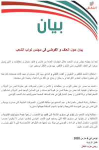 طالب حزب “التكتل الديمقراطي من أجل العمل والحريات”، رئاسة مجلس النواب بالصرامة وعدم التسامح مع مخالفة القانون والتصرفات المشينة في الجلسات العامة، و”التي تمس من سير المؤسسة التشريعية وقيامها بالمهام المناطة بعهدتها دستوريا”.