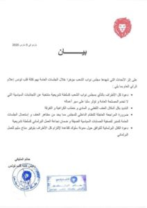 ونددت الكتلة البرلمانية، بكل أشكال العنف اللفظي والمادي وخطاب الكراهية والتفرقة، الذي قد يمارسه النواب في البرلمان، دعوة كل الأطراف بالنأي بمجلس النواب كسلطة تشريعية منتخبة عن التجاذبات السياسية التي لا تخدم المصلحة العامة وتؤثر سلبا على سير أعماله.