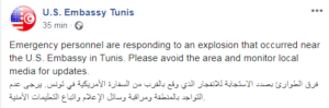 دعت السفارة الأمريكية بتونس، إلى تجنب الإقتراب من منطقة التفجير الذي جد صباح اليوم الجمعة، واتبعا التعليمات الأمنية، ومتابعة المستجدات عبر وسائل الإعلام.