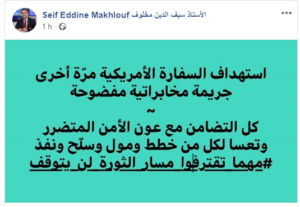 اعتبر القيادي في حزب “ائتلاف الكرامة”، سيف الدين مخلوف، أن استهداف السفارة الأمريكية اليوم الجمعة، هو “جريمة مخابراتية مفضوحة”.