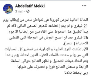 أوضح وزير الصحة، عبد اللطيف المكي، أن الحالة الثانية لمرض “كورونا”، التي سجلت مساء أمس في تونس، هي لمواطن دخل من إيطاليا يوم 21 فيفري الماضي، ولم يتم إخضاعه للحجر الصحي الذاتي.