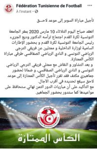 وبالتشاور مع الفريقين المتنافسين، اتّخذت الجامعة القرار، للتوقّي من فيروس “كورونا”، الذي وصل تونس منذ عدّة أيام.