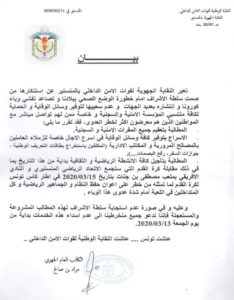 واستنكرت النقابة في بيان لها، صمت سلطة الاشراف أمام خطورة تفشي فيروس “كورونا”، وعدم اسراعها بتوفير كل الوسائل لوقاية الأمنيين من هذا الوباء.