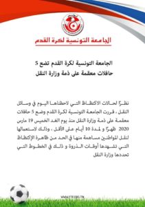 أعلنت الجامعة التونسية لكرة القدم، عن وضع 05 حافلات نقل على ذمة وزارة النقل من أجل الحد من الاكتظاظ في أوقات الذروة.