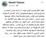 وتعهّد التباسي، بأن يخضع للحجر الصحي، فور عودتهم من السعودية، هو ومن معه من اللاعبين والأطقم الطبية والمدربين التونسيين، وذلك وفقا لتعليمات وزارة الصحة.