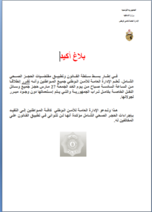 وكانت الإدارة العامة للأمن الوطني، أصدرت أمس بلاغا، نشرته بصفحتها الرسمية على موقع “فيسبوك”، أن هذا القرار يأتي في إطار بسط سلطة القانون، وتطبيق مقتضيات الحجر الصحي الشامل.
