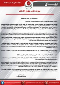 كما دعا الحزب، المؤسسات الوطنية العاملة في هذه الظروف لرفع راية فلسطين إلى جانب الراية الوطنية وخاصة القطاعات الصحية، مع تخصيص وسائل الإعلام مساحة لذكرى يوم الأرض اليوم الاثنين.