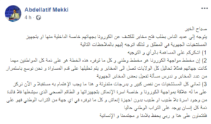 وقال عبد اللطيف المكي، في تدوينة على موقع “فيسبوك”، اليوم الثلاثاء، بأن مخطط مواجهة الفيروس هو مخطط وطني و”كل ما توفره هذه الخطة هو على ذمة كل المواطنين مهما كانت جهاتهم”، وفق قوله.