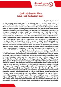 وقال الحزب، في رسالة وجهها إلى رئيس الجمهورية، قيس سعيد، أن كلمة قيس سعيّد غابت فيها الإجراءات والحلول وأنها “لم تتعد التنديد والتشهير والتعبير عن مشاعر التعاطف المجردة مع الفقراء والمعدمين”، كما أنها “لم ترتق إلى مستوى اتخاذ القرارات التي يقتضيها الوضع”.