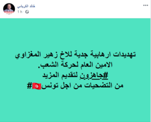 ودوّن خالد الكريشي، على صفحته الرسمية بموقع “فيسبوك”، “تهديدات إرهابية جدية للأخ زهير المغزاوي الأمين العام لحركة الشعب”، مضيفا هاشتاغ “جاهزون لتقديم المزيد من التضحيات من أجل تونس”.
