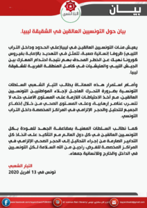 وقال أن مئات التونسيين العالقين في ليبيا يعيشون ظروفا إنسانية صعبة، تتمثل في التهديد بالإصابة بفيروس “كورونا”، ناهيك عن الخطر المحدق بهم نتيجة احتدام المعارك بين الحكومة الليبية وقوات حفتر حول العاصمة طرابلس.