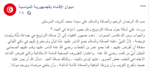 أكد ديوان الإفتاء بالجمهورية التونسية، أنه بالإمكان تأدية صلاة التراويح خلال شهر رمضان المقبل، بالإضافة إلى صلاة العيد، في البيت.