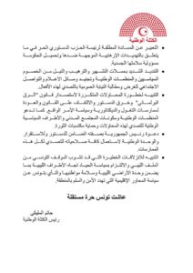 من جهة أخرى، عبرت “الكتلة الوطنية” عن المساندة المطلقة لرئيسة الحزب الدستوري الحر، عبير موسي، فيما يتعلق بالتهديدات الإرهابية الموجهة ضدها، محملة الحكومة مسؤولية سلامتها الجسدية.