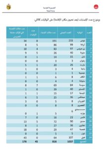 وتتوزع حالات الإصابة، بين 816 حالة شفاء، و45 حالة وفاة، و176 حالة إصابة لا زالت حاملة للفيروس وهي بصدد المتابعة من بينها 3 مقيمين حاليا في المستشفيات.