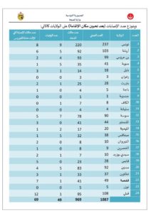 وأظهرت بيانات وزارة الصحة، أن 5 ولايات خالية من الوباء، وهي كل من زغوان وجندوبة والكاف وسليانة، وتوزر، كما أن 12 ولاية يتجاوز فيها عدد الإصابات 3 حالات.