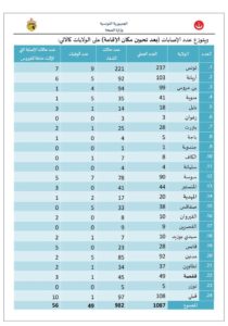 وأظهر بيان الوزارة، وجود 7 ولايات خالية من الفيروس، بعد شفاء جميع المصابين فيها، وهي كل من زغوان، وجندوبة والكاف وسليانة، وصفاقس والقصرين وتوزر.