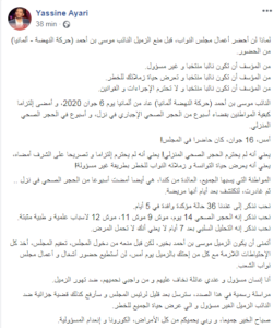 اتهم النائب عن حركة “أمل وعمل”، ياسين العياري، النائب عن كتلة “حركة النهضة”، موسى بن أحمد، بمخالفة الحجر الصحي الاجباري.
