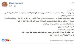 وشدّد الجيلاني الهمامي، في تدوينة له على صفحته بموقع التواصل الاجتماعي “فيسبوك”، على أن قيس سعيّد “أتعس رئيس عرفته تونس”، منتقدا صمته على الماضي الاستعماري الفرنسي “البغيض”.