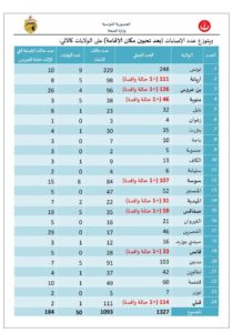 وتتوزع حالات الإصابة الجديدة، في 8 ولايات، وهي كل أريانة وبن عروس ومنوبة، وسوسة والمهدية وصفاقس، بالإضافة إلى قابس وقبلي.