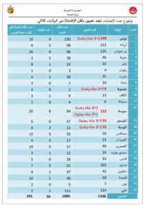 كما تم تسجيل 7 تحاليل إيجابية لحالات إصابة سابقة لا تزال حاملة للفيروس، ليصبح العدد الجملي للمصابين، 1336 حالة تتوزع بين 1095 حالة شفاء و50 حالة وفاة، و191حالة إصابة لا تزال حاملة للفيروس وهي بصدد المتابعة.
