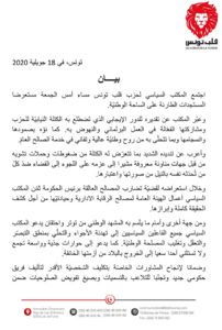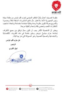 وشدّد بيان الحزب، على ضرورة إجراء “حوارات جدّية وواسعة تجمع ولا تستثني أحدا سعيا إلى الخروج بالبلاد من أزمتها الخانقة”، داعيا جميع الفاعلين السياسيين “إلى تهدئة الأجواء والتحلّي بمنطق التبصّر والتعقّل وتغليب المصلحة الوطنيّة”.