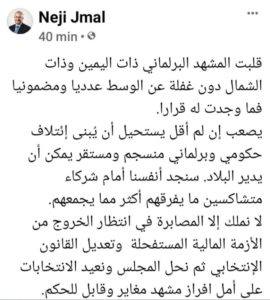 وأوضح النائب، أن “الوضع الحالي لا نملك فيه إلا المصابرة في انتظار الخروج من الأزمة المالية المستفحلة وتعديل القانون الإنتخابي، ثم حلّ المجلس وإعادة الانتخابات على أمل إفراز مشهد مغاير وقابل للحكم”، حسب ماجاء في التدوينة.