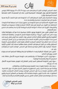 وحول مشاورات تشكيل الحكومة، فقد أوصى المجلس الوطني لحزب “التيار الديمقراطي”، المكتب السياسي “بتكثيف المشاورات على قاعدة تكوين حكومة متضامنة تنأى بنفسها عن المصالح الحزبية، وتكون جادة في مواصلة مسار الإصلاح الفعلي الكفيل بتحسين الأوضاع الاقتصادية والاجتماعية للبلاد”، وفق نص البيان.