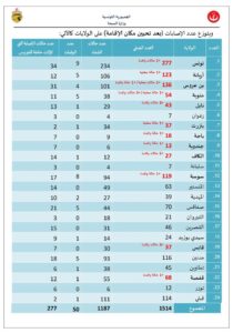 وأصبح بذلك العدد الجملي للمصابين بهذا الفيروس 1514 حالة مؤكدة، تتوزع بين 1187 حالة شفاء و50 حالة وفاة، و277 حالة إصابة لا تزال حاملة للفيروس، من بينها 09 حالات إصابة وقع التكفل بها في المستشفى.